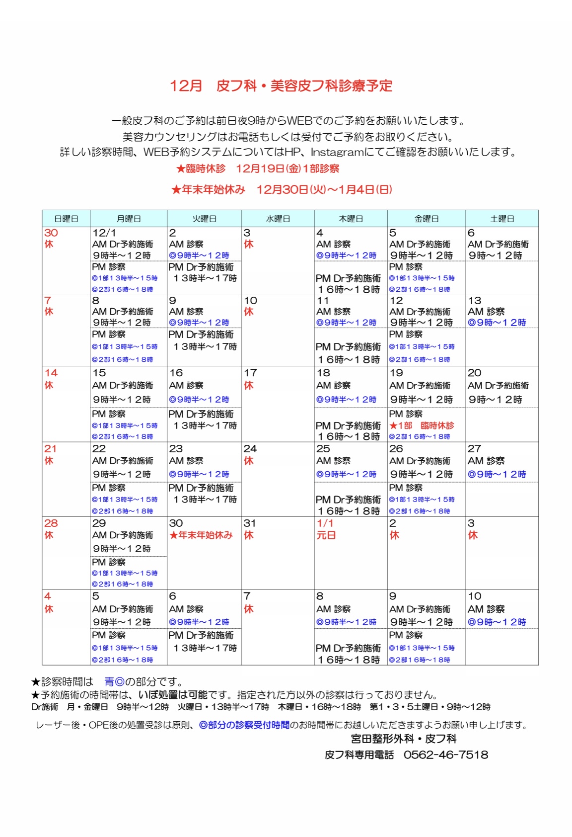 皮フ科・美容皮フ科 12月診療予定 ★臨時休診 12月19日1部診察 ★年末年始休み 12月3...